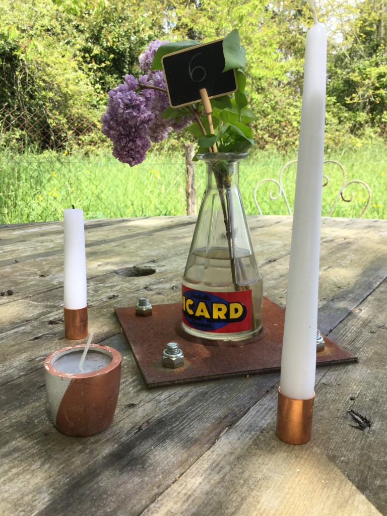 Après quelques jours de meuleuse et de pince, j’ai réalisé aujourd’hui l’essai déco pour le mariage sur le thème « récup’ – industriel ». Porte-menu et bougeoirs en cuivre, marque-place taillés dans des ardoises, photophore en plâtre, fleurs du jardin dans des carafes/bouteilles. Défi réussi ! Les futurs mariés sont ravis.